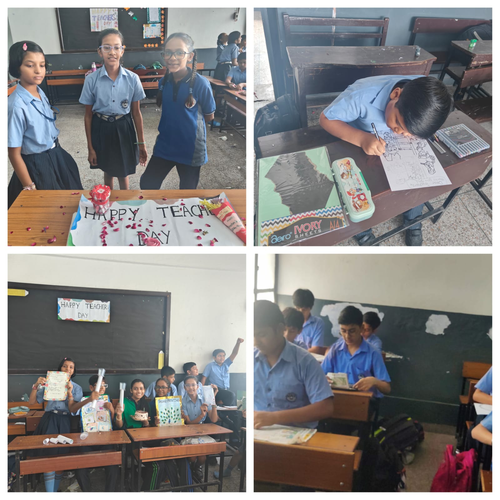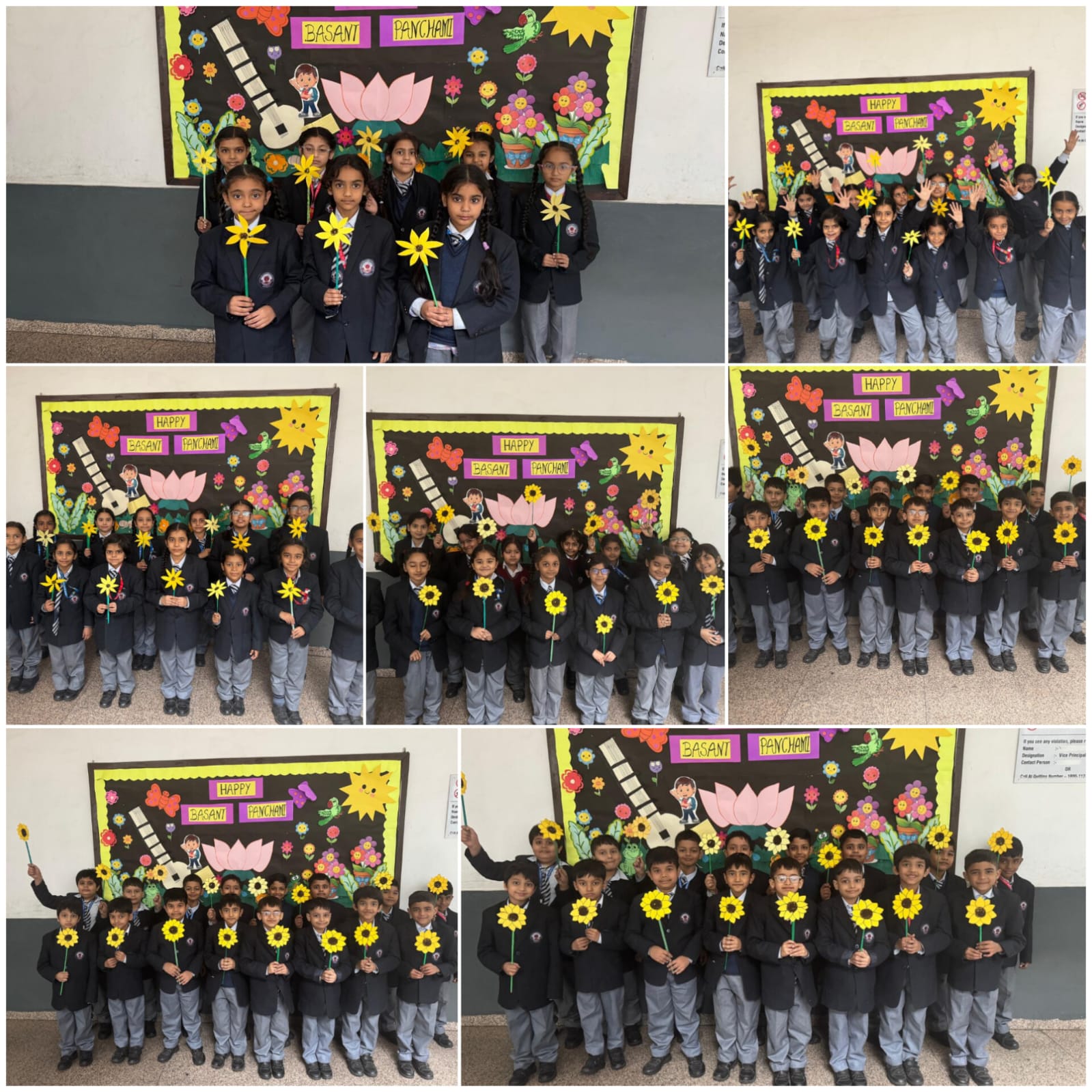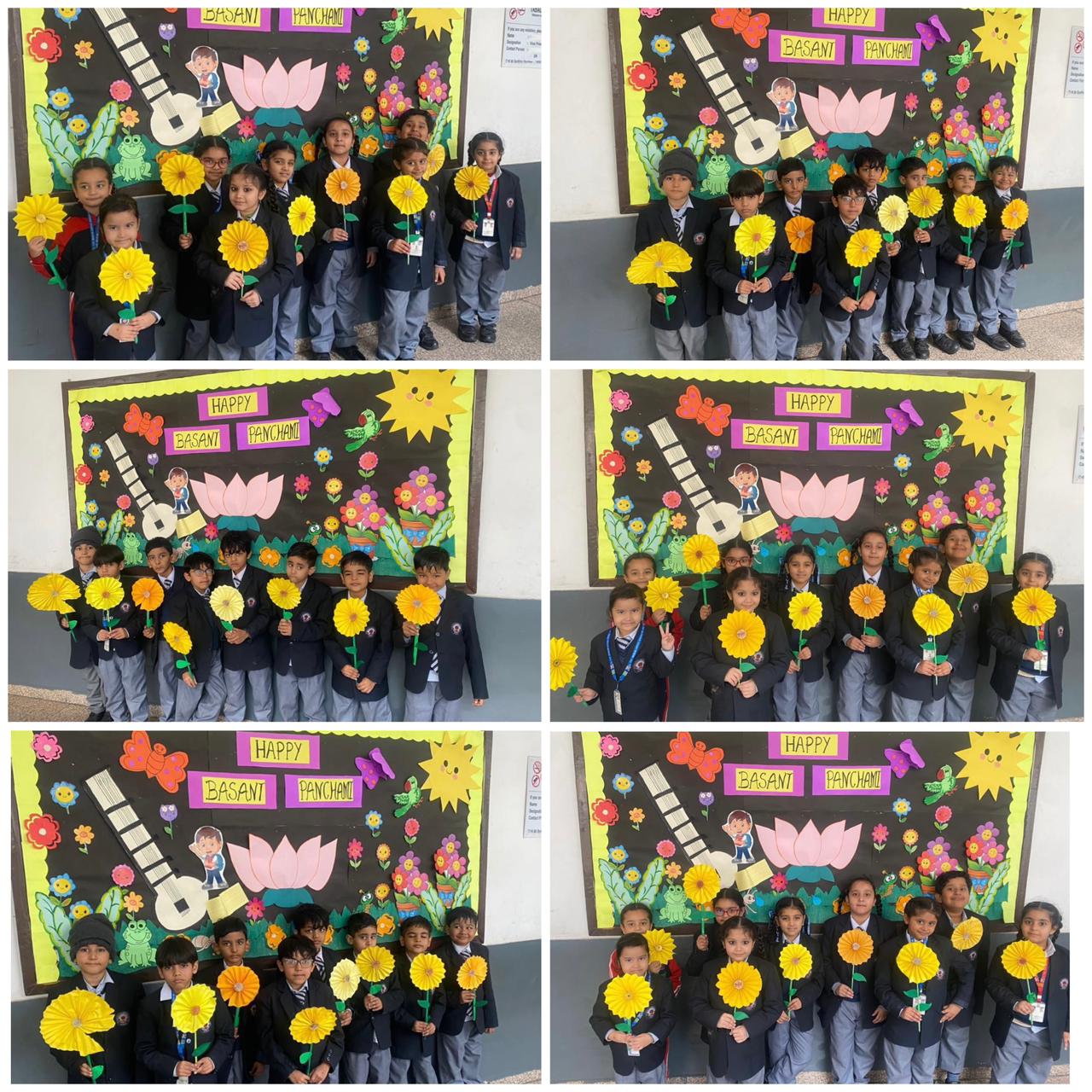 The classrooms were decorated with a yellow theme. Students enthusiastically participated in colouring Basant Panchami–related worksheets and a paper craft activity, where they made beautiful sunflower crafts, showcasing their creativity. Children also brought and shared yellow-coloured food, which added to the festive spirit to the day.