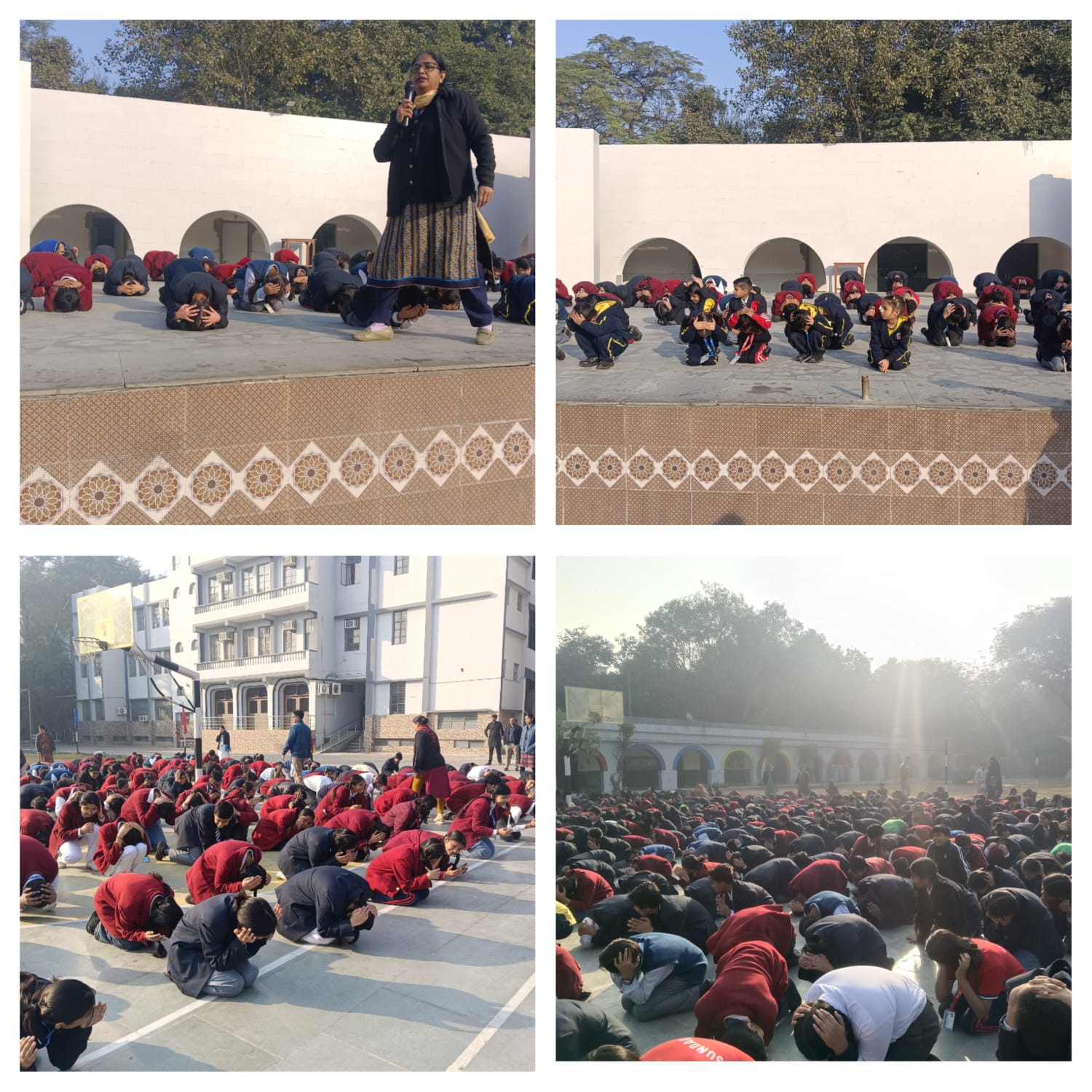 Following the introductory segment, a practical demonstration on Earthquake Safety Response was carried out. Students were actively involved in practicing the technique of Duck–Cover–Hold. The exercise emphasized staying calm, listening to instructions, and ensuring orderly and safe movement during an earthquake. All students and teachers enthusiastically took part, making the demonstration highly impactful and meaningful.